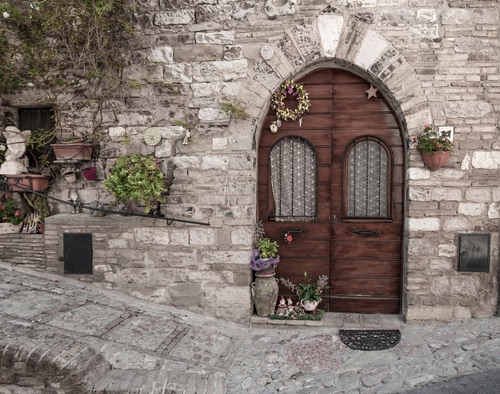 Tag: porta, vasi, fiori, zerbino, portone, muro, pietre, salita, piante.