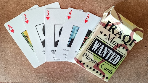 Questi mazzi di carte furono stampati durante il conflitto in Iraq. Uno di questi fu recuperato dai nostri militari a Nassiriya quando furono inviate le forze di peacekeeping.