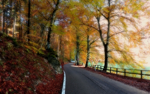 Tag: strada, foglie, autunno, alberi, staccionata, giallo, asfalto, rosso, rami, verde, bosco, cielo, acqua, ombra, linea, striscia, lago.