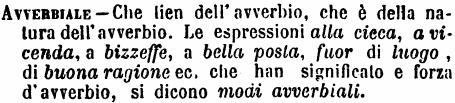 Avverbiale - Che tien dell'avverbio, che è della natura dell'avverbio. Le espressioni alla cieca, a vicenda, a bizzeffe, a bella posta, fuor di luogo, di buona ragione ec. che han significato e forza d'avverbio, si dicono modi avverbiali. [immagine] |