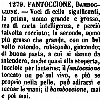 Fantoccione, Bamboccione - Voci di celia significanti, la prima, uomo grande e grosso, ma di corta intelligenza, e perciò talvolta cocciuto; la seconda, uomo più grasso che grande, con un bel volto rotondo, rubicondo, giocondo; di buona pasta, a cui si danno da intendere, anche quasi alla scoperta, lucciole per lanterne; il fantoccione toccato un po' sul vivo, e più se proprio nella pelle, può adirarsi e menar le mani; il bamboccione, mai e poi mai. [immagine] |