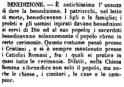 Benedizione - E' antichissima l'usanza di dare la benedizione. I patriarchi, nel letto di morte, benedicevano i figli e la famiglia; i profeti e gli uomini ispirati davano benedizioni ai servi di Dio ed al suo popolo; i sacerdoti benedicevano solennemente il popolo ebreo in certe cerimonie. Questo costume passò presso i Cristiani, e si è sempre mantenuto presso i Cattolici Romani, fra i quali si pratica in quasi tutte le cerimonie. Difatti, nella Chiesa Romana si benedice non solo il popolo, ma anche le chiese, i cimiteri, le case e le campane. [immagine] |