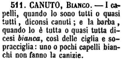 | Canuto, Bianco - I capelli, quando lo sono tutti o quasi tutti, diconsi canuti; e la barba, quando lo è tutta o quasi tutta dicesi bianca, così delle ciglia e sopracciglia: uno o pochi capelli bianchi non fanno la canizie. [immagine] |
