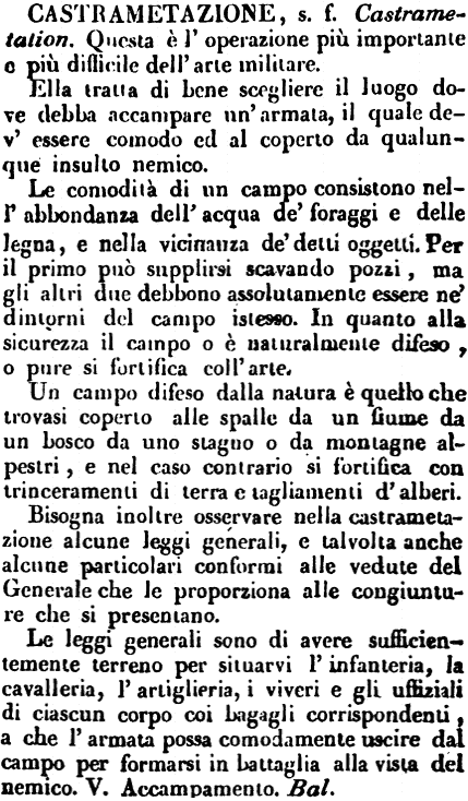 Ella tratta di bene scegliere il luogo dove debba accampare un'armata, il quale dev'essere comodo ed al coperto da qualunque insulto nemico. Le comodità di un campo consistono nell'abbondanza dell'acqua de' foraggi e delle legna, e nella vicinanza de' detti oggetti. Per il primo può supplirsi scavando pozzi, ma gli altri due debbono assolutamente essere ne' dintorni del campo istesso, In quanto alla sicurezza il campo o è naturalmente difeso, o pure si fortifica coll'arte. Un campo difeso dalla natura è quello che trovasi coperto alle spalle da un fiume da un bosco da uno stagno o da montagne alpestri, e nel caso contrario si fortifica con trinceramenti di terra e tagliamenti d'alberi. Bisogna inoltre osservare nella castrametazione alcune leggi generali, e talvolta anche alcune particolari conformi alle vedute del Generale che le proporziona alle congiunture che si presentano. Le leggi generali sono di avere sufficientemente terreno per situarvi l'infanteria, la cavalleria, l'artiglieria, i viveri e gli uffiziali di ciascun corpo coi bagagli corrispondenti, a che l'armata possa comodamente uscire dal campo per formarsi in battaglia alla vista del nemico. V. Accampamento. Bal. [immagine] |