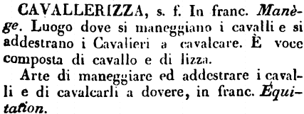 Cavallerizza - S. f. Da CAVALLO. Luogo destinato all'insegnamento e all'esercizio del cavalcare. (Fanf.) Stor. Ajolf. (C) Andava ogni mattina alla cavallerizza, e maneggiava molti cavalli. [Val.] Cocch. Op. 1. 447. Quanto bisogna per imparare il buon francese, il ballo, la cavallerizza.