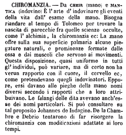 Chiromanzia - S. f. Dal gr. Χεῖρ, χειρὸς, Mano, e Μαντεία, Indovinamento. Arte vana, per la quale alcuni presumono di indovinare il futuro, guardando le linee della mano. Pass. 340. (C) Se altri considerasse i lineamenti, cioè cotali righe e fessure delle mani, si chiamerebbe chiromanzia. Ott. Com. Inf. 10. Chi considera congiunture di mani e lineazioni di palme, appellata è chiromanzía. E appresso: (M.) Ed è alcuna verità nella chiromanzía. [Val.] Ner. Sammin. 9. 9. Da quello sono ammaestrate nella chiromanzía di tutto punto. |