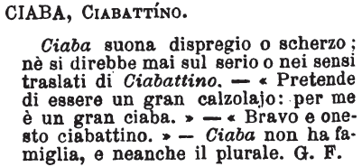Ciaba, Ciabattino - Ciaba suona dispregio o scherzo; nè si direbbe mai sul serio o nei sensi traslati di Ciabattino. - «Pretende di essere un gran calzolajo: per me è un gran ciaba.» - «Bravo e onesto ciabattino.» - Ciaba non ha famiglia, e neanche il plurale. G. F. [immagine] |