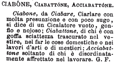 Ciabone, Ciabattone, Acciabattone - Ciabone, da Ciabare, Ciarlare con molta presunzione e con poco sugo, si dice di un Cicalatore vuoto, gonfio e nojoso; Ciabattone, di chi è con goffa sciattezza trascurato nel vestire, nel far le cose domestiche o nei lavori d'arti o di mestieri; Acciabattone soltanto di chi è disordinatamente affrettato nel lavorare. G. F. [immagine] |