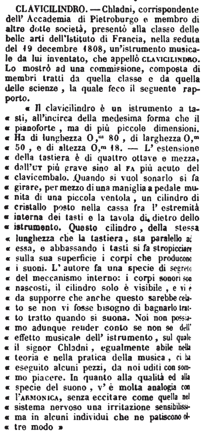 «Il clavicilindro è un istrumento a tasti, all’incirca della medesima forma che il pianoforte, ma di più piccole dimensioni. Ha di lunghezza 0,m 80, di larghezza 0,m 50, e di altezza 0,m 18. – L’estensione della tastiera è di quattro ottave e mezza, dall’ut più grave sino al fa più acuto del clavicembalo. Quando si vuol sonarlo si fa girare, per mezzo di una maniglia a pedale munita di una piccola ventola, un cilindro di cristallo posto nella cassa fra l’estremità interna dei tasti e la tavola di dietro dello istrumento. Questo cilindro, della stessa lunghezza che la tastiera, sta parallelo ad essa, e abbassando i tasti si fa stropicciare sulla sua superficie i corpi che producono i suoni. L’autore fa una specie di segreto del meccanismo interno: i corpi sonori son nascosti, il cilindro solo è visibile, e vi è da supporre che anche questo sarebbe celato se non vi fosse bisogno di bagnarlo tratto tratto quando si suona. Noi non possiamo adunque render conto se non se dell’effetto musicale dell’istrumento, sul quale il signor Chladni, egualmente abile nella teoria e nella pratica della musica, ci ha eseguito alcuni pezzi, da noi uditi con sommo piacere. In quanto alla qualità ed alla specie del suono, v’è molta analogia con l’armonica, senza eccitare come quella nel sistema nervoso una irritazione sensibilissima in alcuni individui che ne patiscono oltre modo » [immagine] |