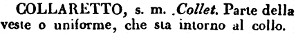 Collaretto - s. m. Collet. Parte della veste o uniforme, che sta intorno al collo. [immagine] |