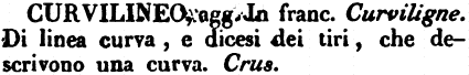Curvilineo - agg. In franc. Curviligne. Di linea curva, e dicesi dei tiri, che descrivono una curva. Crus. [immagine] |