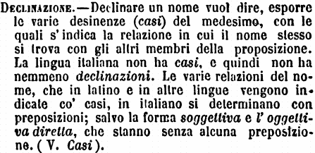 Declinazione - Declinare un nome vuol dire, esporre le varie desinenze (casi) del medesimo, con le quali s'indica la relazione in cui il nome stesso si trova con gli altri membri della proposizione. La lingua italiana non ha casi, e quindi non ha nemmeno declinazioni. Le varie relazioni del nome, che in latino e in altre lingue vengono indicate co' casi, in italiano si determinano con preposizioni; salvo la forma soggettiva e l'oggettiva diretta, che stanno senza alcuna preposizione. (V. Casi). [immagine] |