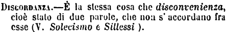Discordanza - E' la stessa cosa che disconvenienza, cioè stato di due parole, che non s'accordano fra esse (V. Solecismo e Sillessi). [immagine] |