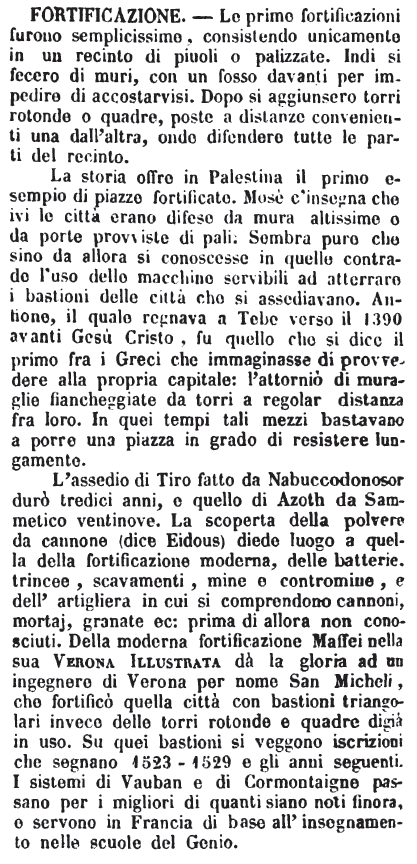 La storia offre in Palestina il primo esempio di piazze fortificate. Mosè c'insegna che ivi le città erano difese da mura altissime o da porte provviste di pali. Sembra pure che sino da allora si conoscesse in quelle contrade l'uso delle macchine servibili ad atterrare i bastioni delle città che si assediavano. Antione, il quale regnava a Tebe verso il 1390 avanti Gesù Cristo, fu quello che si dice il primo fra i Greci che immaginasse di provvedere alla propria capitale: l'attorniò di muraglie fiancheggiate da torri a regolar distanza fra loro. In quei tempi tali mezzi bastavano a porre una piazza in grado di resistere lungamente. L'assedio di Tiro fatto da Nabuccodonosor durò tredici anni, e quello di Azoth da Sammetico ventinove. La scoperta della polvere da cannone (dice Eidous) diede luogo a quella della fortificazione moderna, delle batterie, trincee, scavamenti, mine e contromine, e dell'artiglieria in cui si comprendono cannoni, mortaj, granate ec: prima di allora non conosciuti. Della moderna fortificazione Maffei nella sua Verona Illustrata dà la gloria ad un ingegnere di Verona per nome San Micheli, che fortificò quella città con bastioni triangolari invece delle torri rotonde e quadre digià in uso. Su quei bastioni si veggono iscrizioni che segnano 1523 - 1529 e gli anni seguenti. I sistemi di Vauban e di Cormontaigne passano per i migliori di quanti siano noti finora, e servono in Francia di base all'insegnamento nelle scuole del Genio. [immagine] |