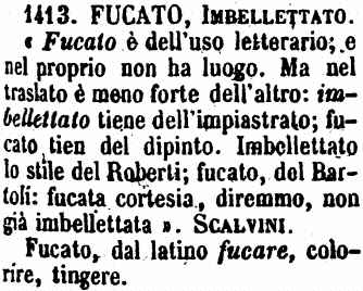 Fucato, Imbellettato - «Fucato è dell'uso letterario; e nel proprio non ha luogo. Ma nel traslato è meno forte dell'altro: imbellettato tiene dell'impiastrato; fucato tien del dipinto. Imbellettato lo stile del Roberti; fucato, del Bartoli: fucata cortesia, diremmo, non già imbellettata». Scalvini.