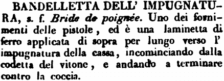 Bandelletta dell'impugnatura - s. f. Bride de poignée. Uno dei fornimenti delle pistole, ed è una laminetta di ferro applicata di sopra per lungo verso l'impugnatura della cassa, incominciando dalla codetta del vitone, e andando a terminare contro la coccia. [immagine] |