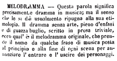 Melodramma - Questa parola significa precisamente dramma in musica; ma il senso che le si dà usualmente ripugna alla sua etimologia. Il dramma senza arte, pieno d'enfasi e di guazza buglio, scritto in prosa triviale, ecco qual'è il melodramma originale, che preude il nome da qualche frase di musica posta al principio e alla fine di ogni scena per annunziare l'entrare e l'uscire dei personaggi. [immagine] |