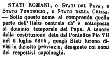Stati romani, o Stati del Papa, o Stato Pontificio, o Stato della Chiesa - Sotto questo nome si comprende quella parte dell'Italia centrale ch'è sottoposta al dominio temporale del Papa. A tenore della costituzione data dal Pontefice Pio VII nel luglio 1816, quegli Stati furono divisi in diciotto provincie, designate coi nomi dei respettivi capoluoghi. [immagine] |