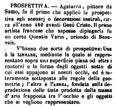 V'hanno due sorta di prospettiva: Una è la lineare, mediante la quale si rappresentano sopra una superficie piana od altra i contorni e le forme degli oggetti sotto di cui essi appajono ai nostri occhi, ed è interamente sottoposta alle regole della geometria; l'altra è l'aerea, fondata sulla degradazione delle tinte prodotta dalla massa d'aria frapposta tra l'occhio e gli oggetti che si vogliono rappresentare. [immagine] |