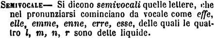 Semivocale - Si dicono semivocali quelle lettere, che nel pronunziarsi cominciano da vocale come effe, elle, emme, enne, erre, esse, delle quali le quattro l, m, n, r sono dette liquide. [immagine] |