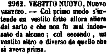 Vestito nuovo, Nuovo vestito - Col primo modo s'intende un vestito fatto allora allora dal sarto e che non fu mai indossato da alcuno; col secondo, un vestito altro o diverso da quello che si aveva prima. [immagine]