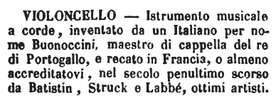 Violoncello - Istrumento musicale a corde, inventato da un italiano per nome Buonoccini, maestro di cappella del re di Portogallo, e recato in Francia, o almeno accreditatovi, nel secolo penultimo scorso da Batistin, Struck e Labbè, ottimi artisti. [immagine] |